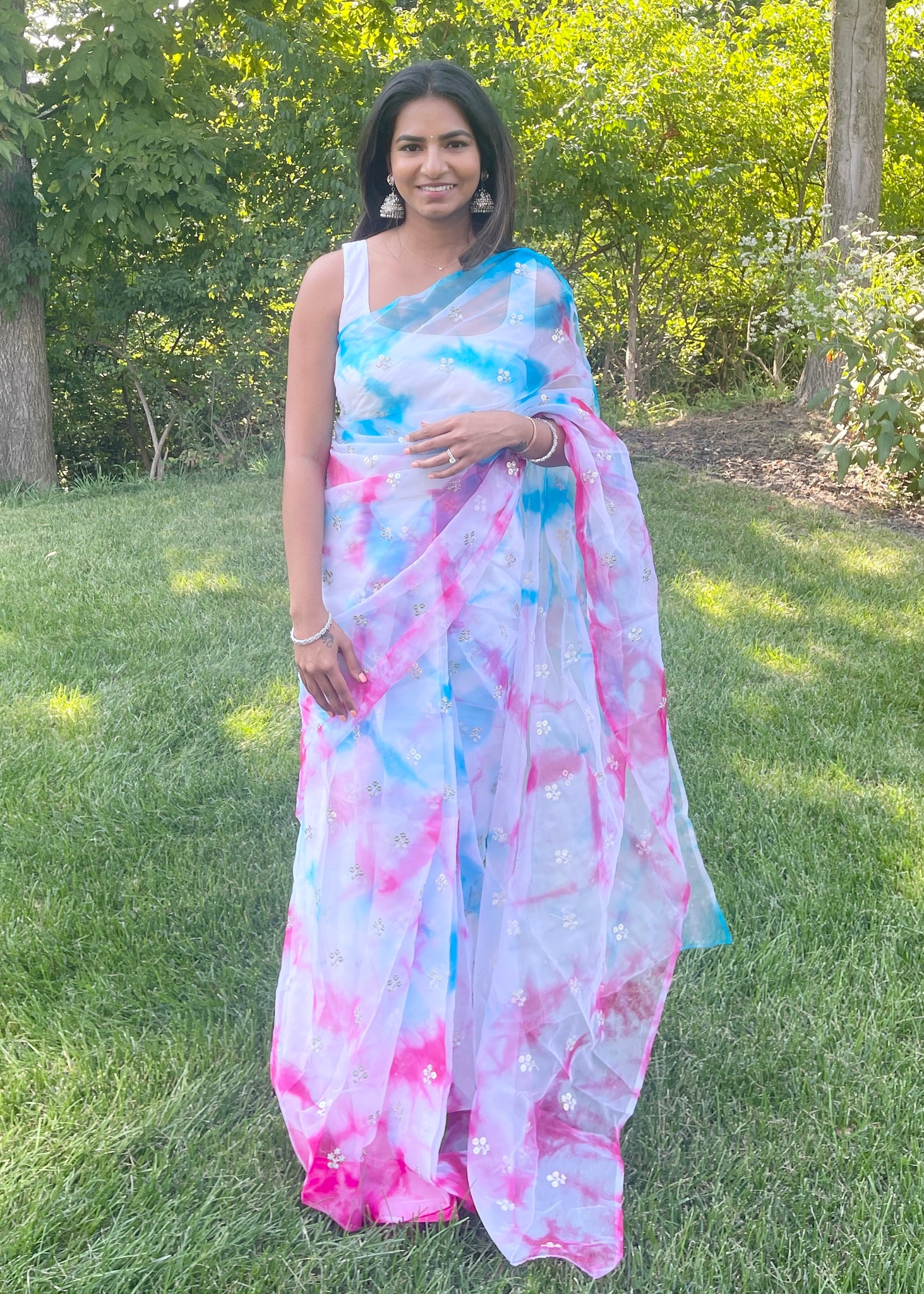 Pre-stitched Pink and Blue Tie and Dye Organza Saree and Blouse (Set)